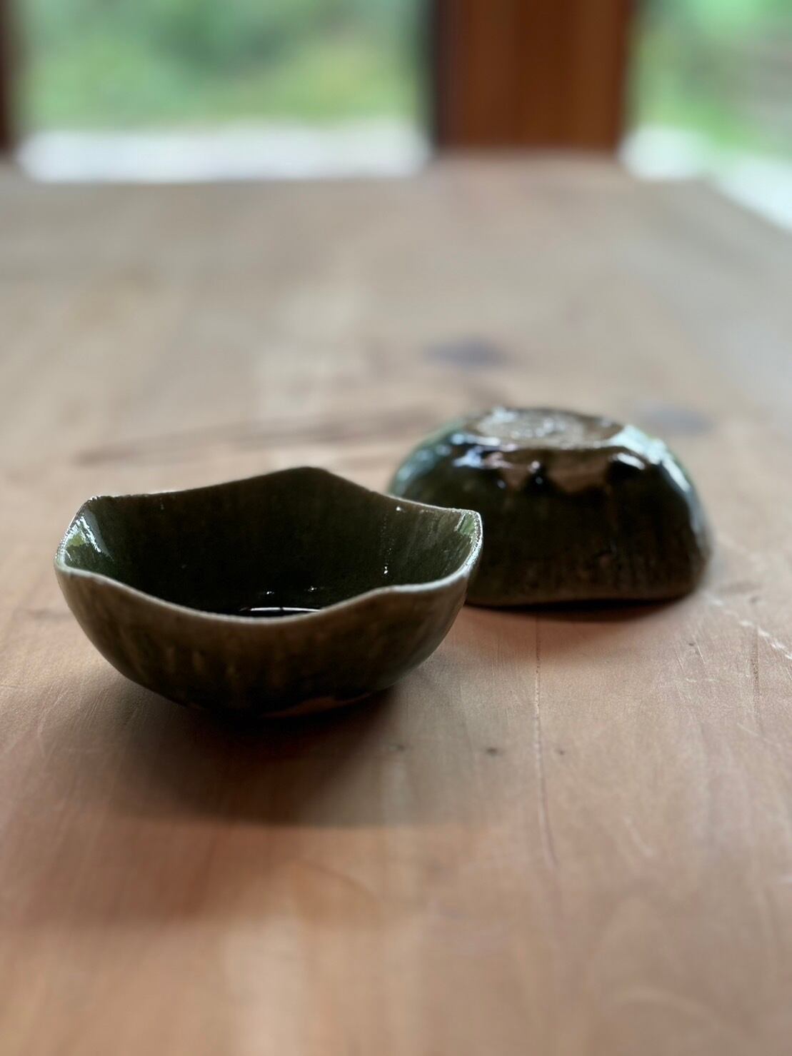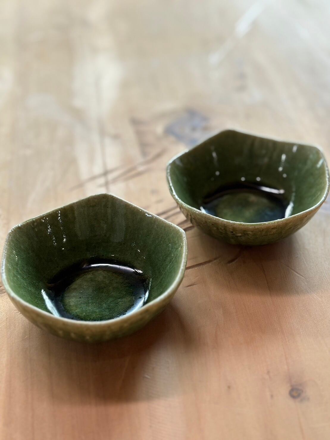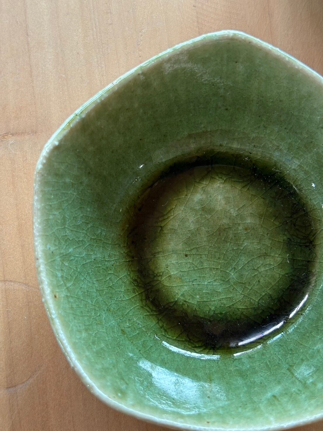 明るい織部釉の色です。珍味を入れたり、醤油、おつけものの受け皿にもできます。