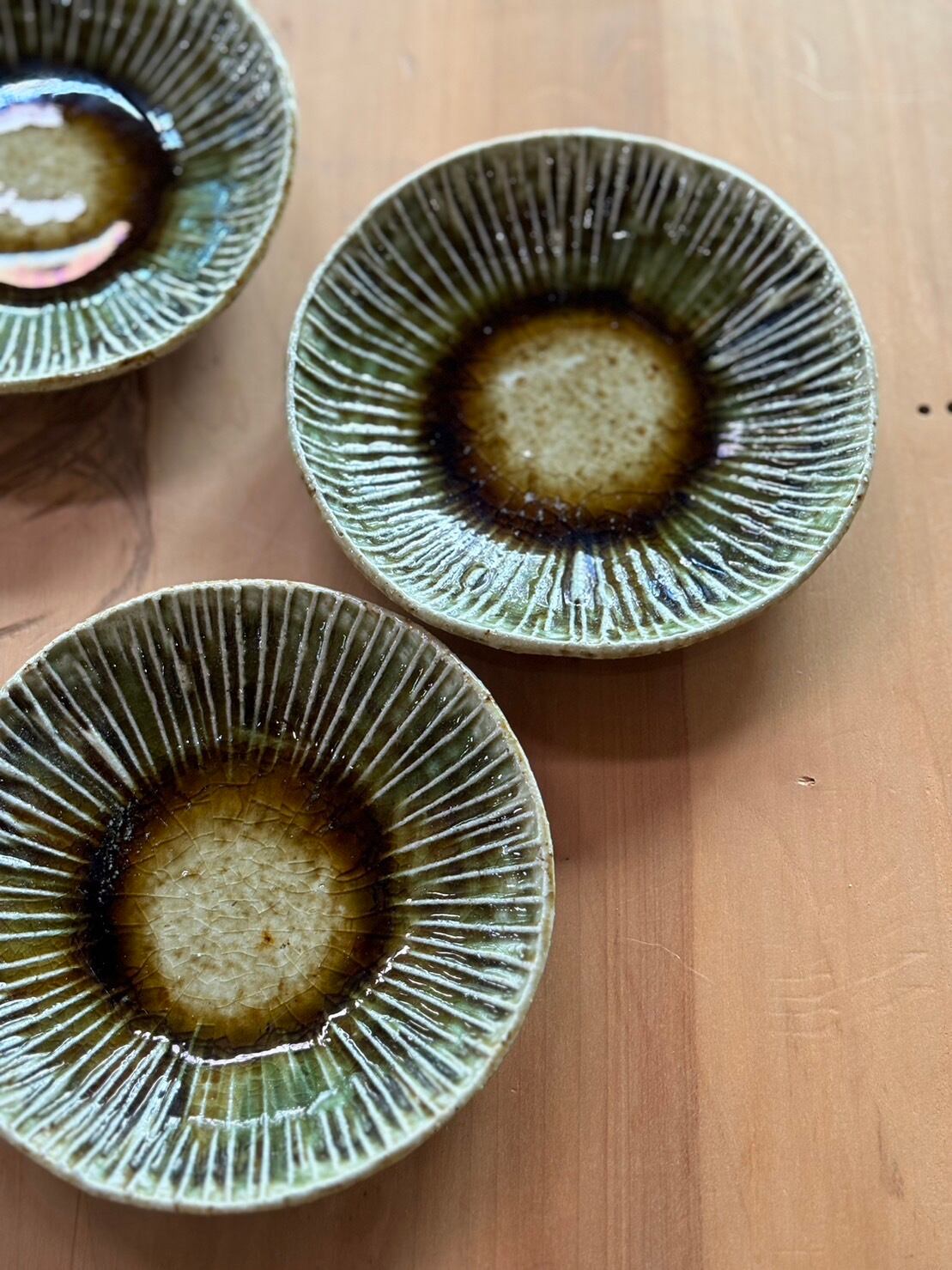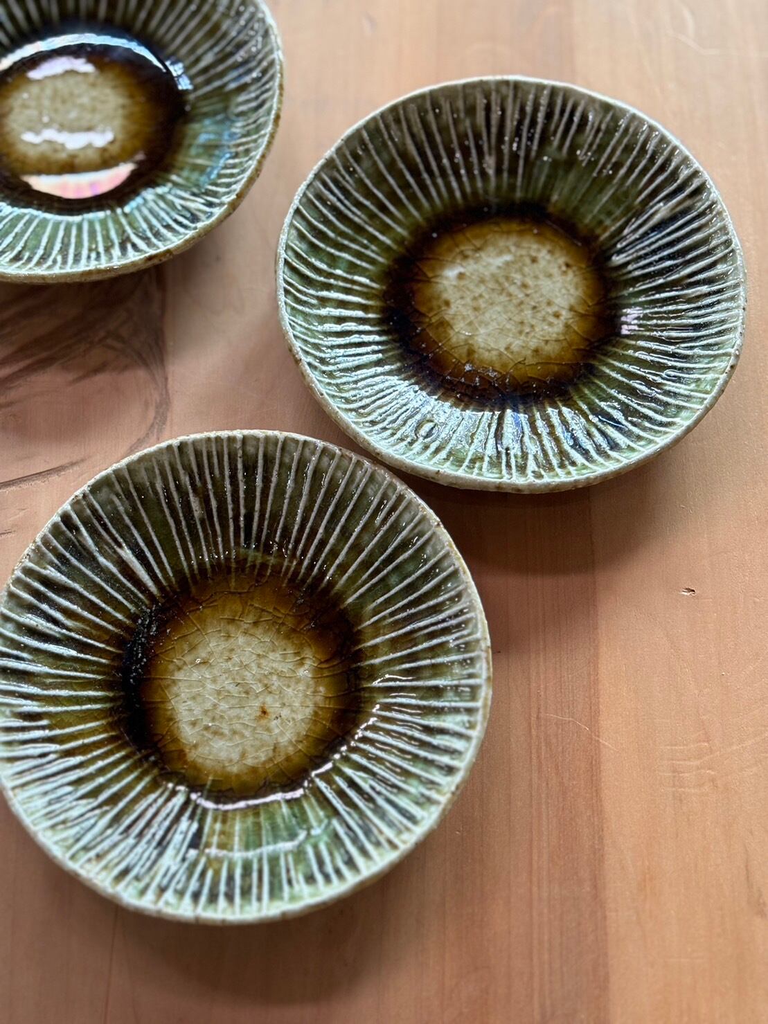 織部釉の色の元は銅で、黄瀬戸釉は若干の鉄分であります。八ヶ岳の土は採取した場所により色合いも変化します。焼成すると窯の中の場所などの条件により色の変化が生じます。写真、PCでも変化します。