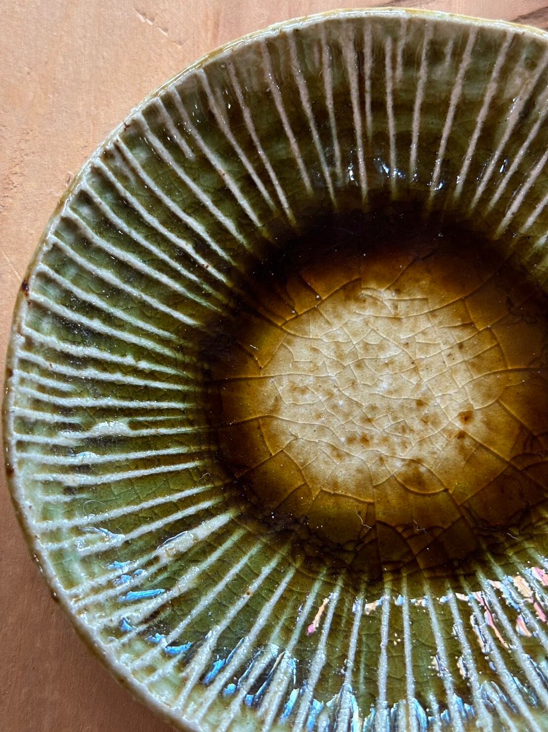 黄瀬戸釉の上に強めの織部を重ねてあります。